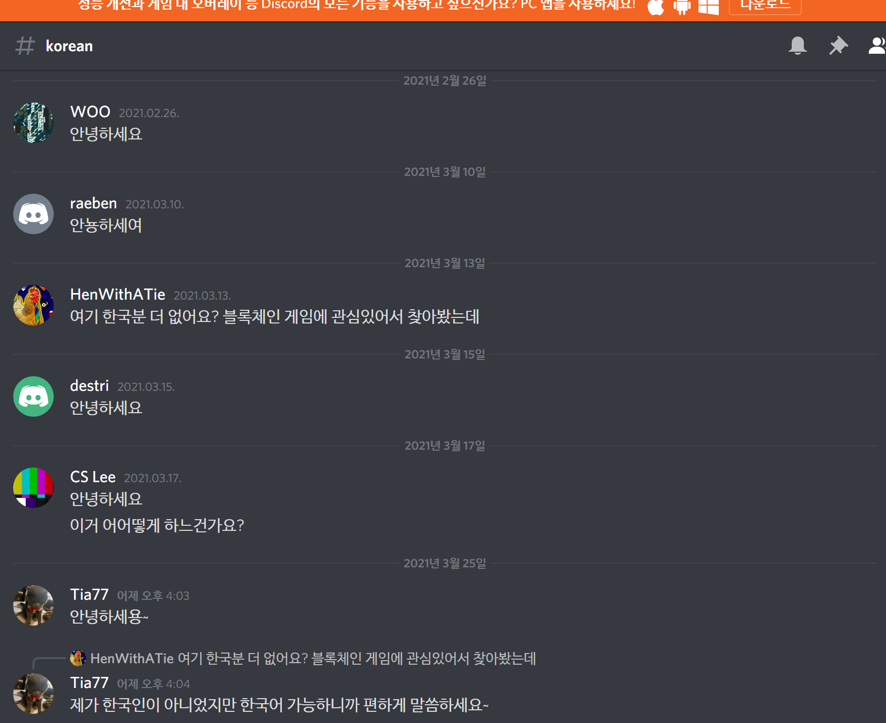 한국인 채널에는 사람들이 전무하다.. 한국분도 없고, 보다못해서 외국인이 알려주는 형국이다. 개인적으로 GALA games를 통해서도 한국인 파워라는게 있다고 생각을 하는데, 아직 한국인들의 관심이 없이도, 이렇게나 열광적으로 사람들이 관심을 가져준다면 더 클 가능성이 있다고 생각한다.