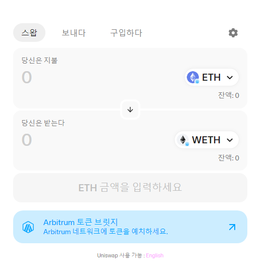 2. 개인지갑에 ETH가 들어오면 WETH (wrapped ETH)로 바꿀 차례 입니다! 아이셔노드는 WETH로 살 수 있거든요!. 아비트럼 TVL 1위 DEX인 유니스왑으로 들어가봅시다.