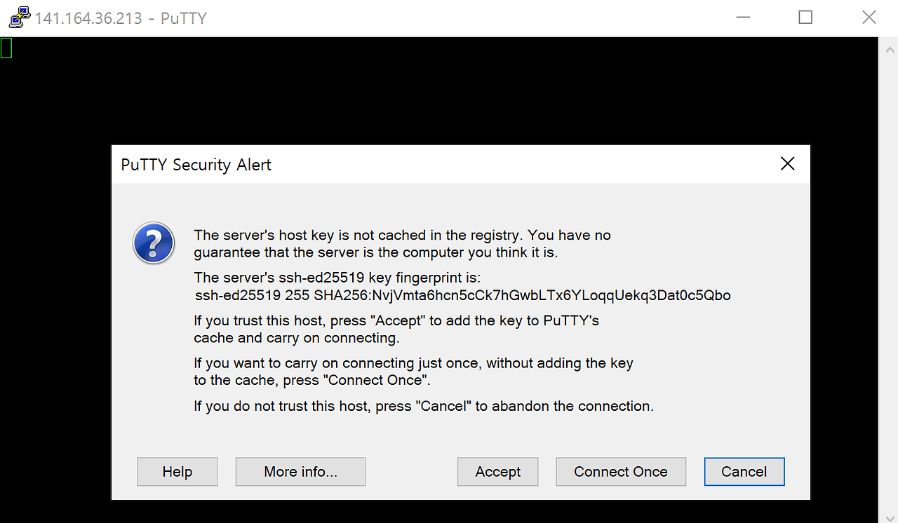 아까 개인키와 공개키를 저장해두라는 거 잊지않으셨죠? 짧은 공개키를 입력하시면 됩니다. 이후에 승인 다해주시고, 다시 putty로 이동합시다.
