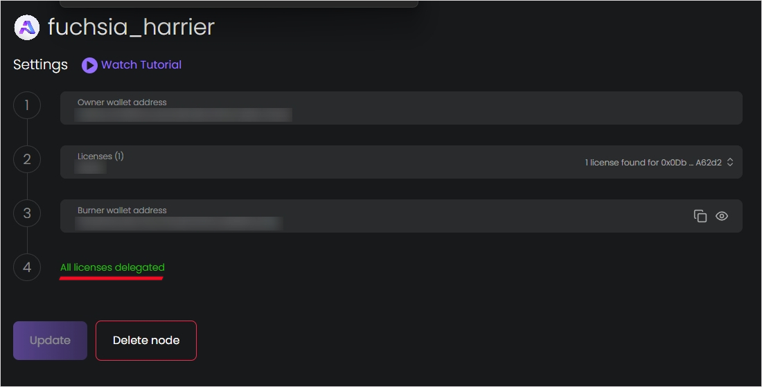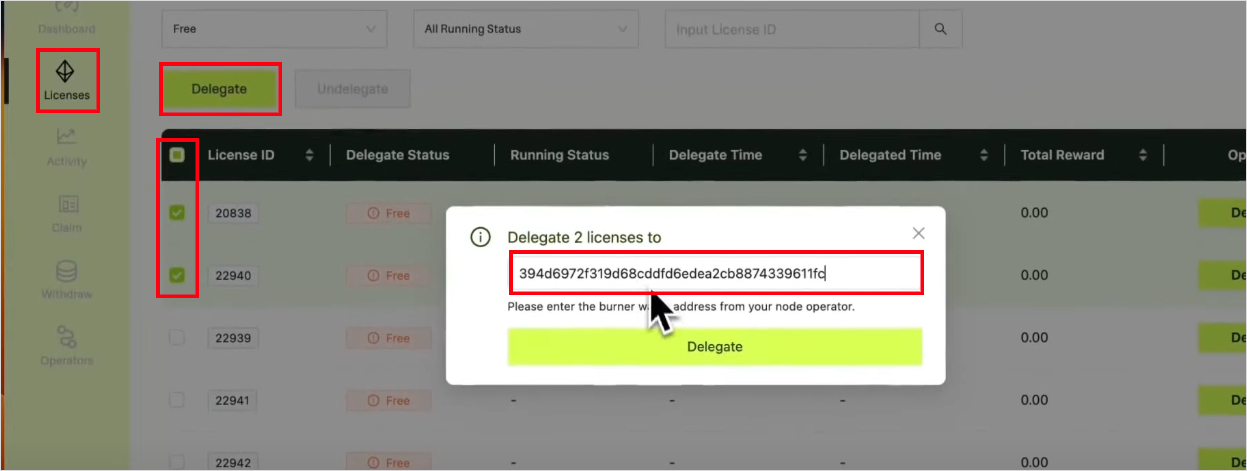 License로 들어가시면 본인이 구입한 라이센스들이 보일겁니다. 다 체크하시고, Delegate 누르시면 지갑 입력칸이 뜹니다.