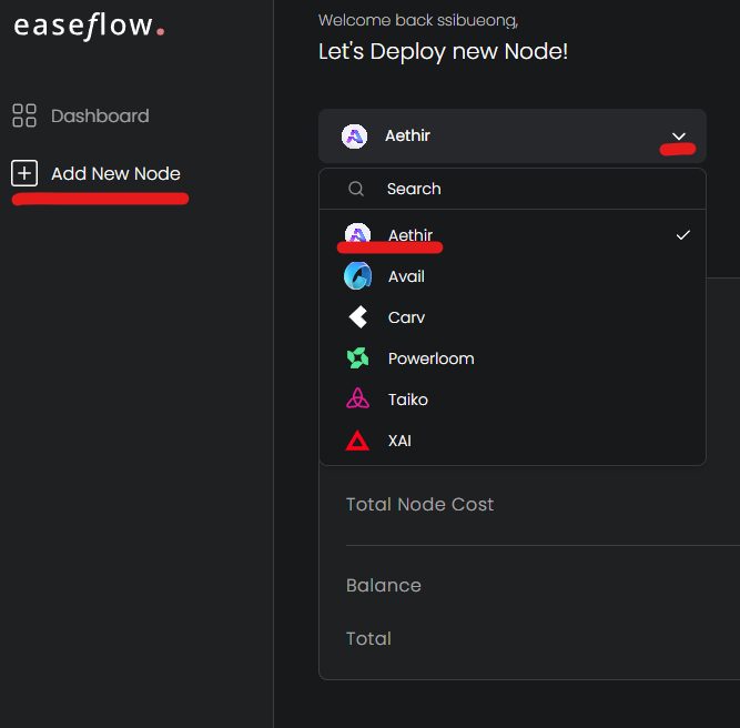 Add new node 누르시고, Aethir 누르시고